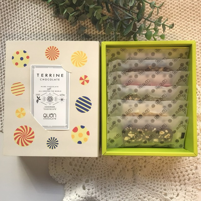 テリーヌ6枚ギフトBOX 1,900円 【内容】 ・テリーヌ(おすすめ) 6枚 【商品説明】 ・テリーヌ・・・QUONチョコレートの代名詞商品『QUONテリーヌ』上質な世界各地のカカオをベースにドライフルーツやナッツ等を詰め込んだ個性溢れる美味しさ。おすすめの6枚をセレクト致します。 ※ギフトBOXのデザインは在庫状況により変更させていただく場合がございます。 予めご了承ください。 【アレルギー】 小麦・乳・卵・アーモンド・オレンジ・メロン・りんご・大豆 を使用しております。 【のし】をご希望の方はオプションからご選択ください。 お名前入れや選択以外の項目、その他ご要望がございましたら、お問い合わせフォームよりご連絡下さい。 【紙袋】をご希望の方はオプションからご選択ください。